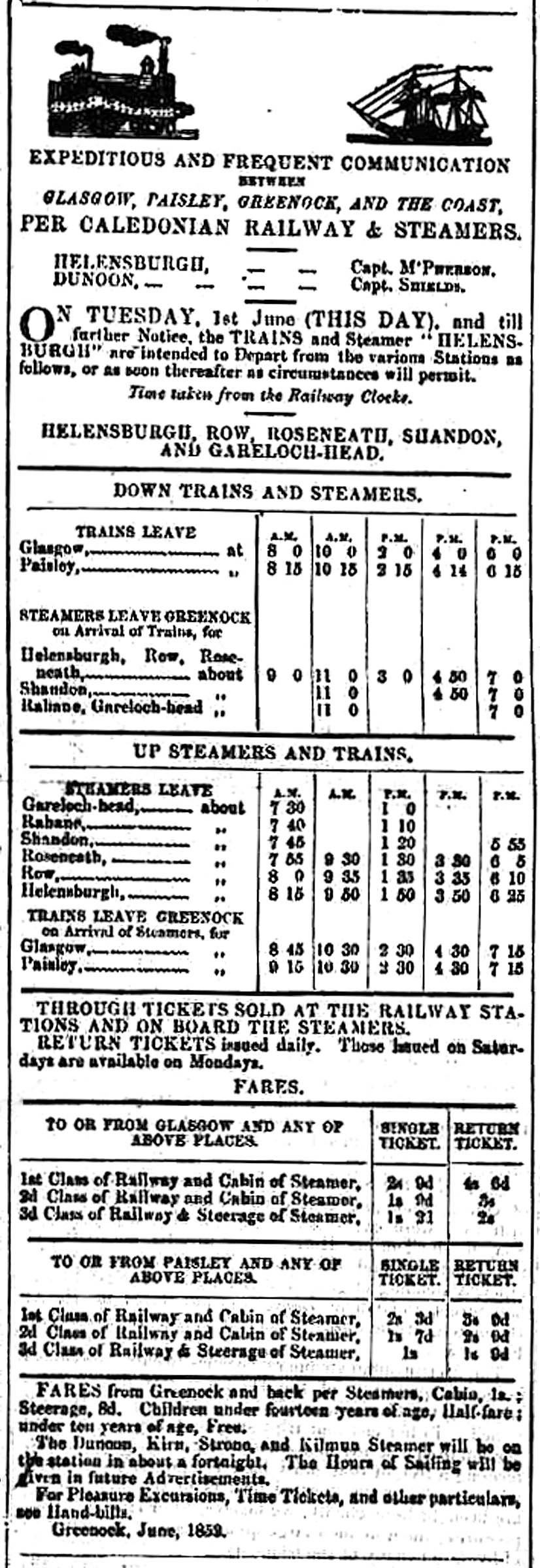 “The summer arrangements of the Greenock section of the Caledonian Railway Company, showing connection of trains with steamers to and from the coast, have been published, and will come into operation on 15th May. Steamers will run to Garelochhead in connection with the trains leaving Glasgow at 8 a.m., 3:40, 4 (express reaching Greenock at 4:40), and 6 p.m.; to Kilmun with those of 3:40, 4, and 6 p.m.; to Rothesay, with those of 11 a.m., 2, 3:40, 4, 5, and 6 p.m.; and Millport, with those of 3 and 6 p.m. Steamers will leave Millport, in connection with the trains starting from Greenock, at 8:55 and 10:30 a.m.; Rothesay, with those of 8:20, 8:45, 10:30 a.m., and 7:30 p.m.; Kilmun, with those of 8:45, 10:30 a.m., and 7:30 p.m.; and Garelochhead, with those of 8:20, 8:55, 10:30 a.m., 12:30, and 5:30 p.m. A low scale of single journey and return fares to and from Glasgow and the various watering places has also been issued.”—Greenock Advertiser, March 18, 1856.