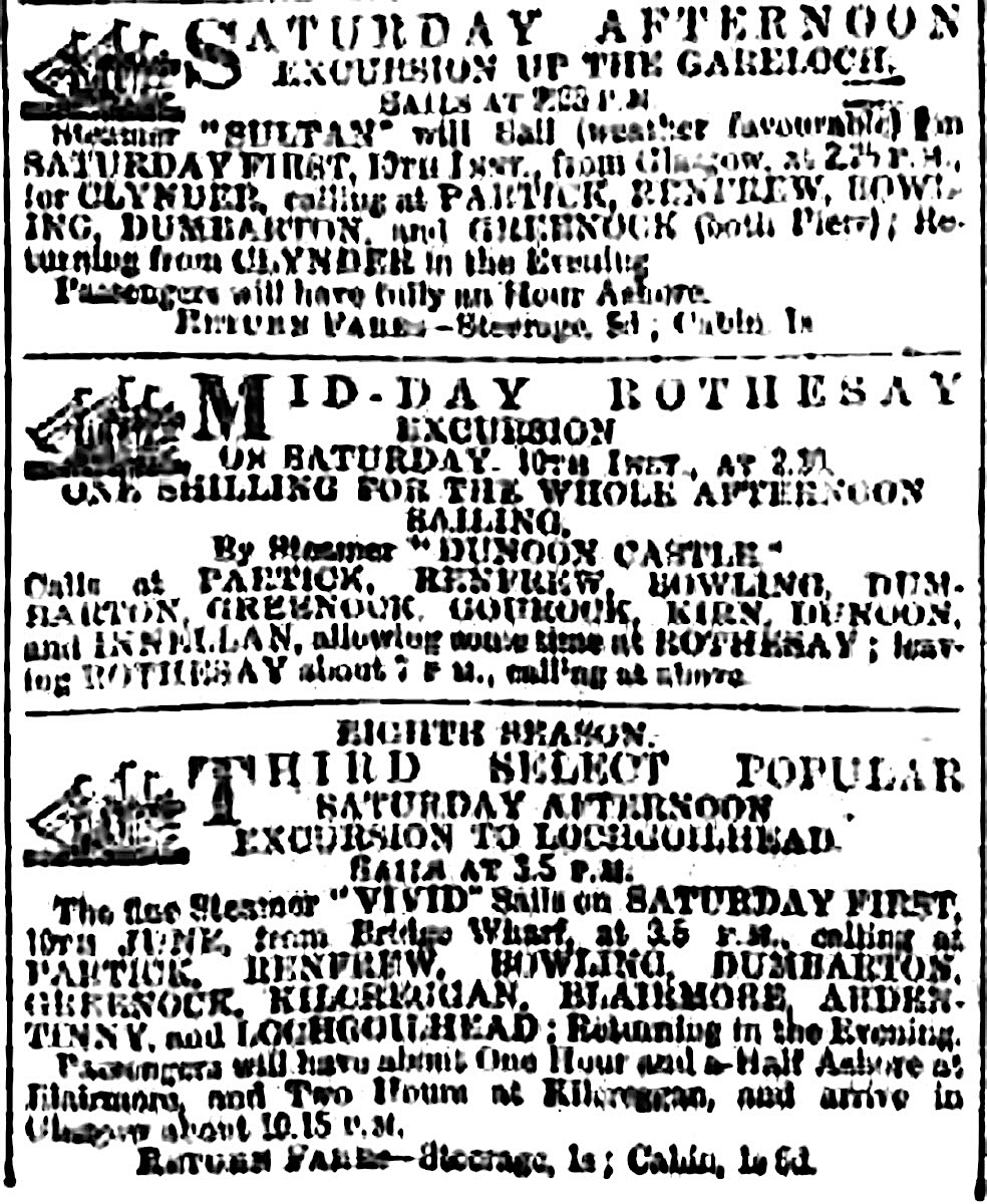 In 1875, steamers regularly calling at the new pier were Vivid for Kilmun, Viceroy and Hero for Rothesay, and Balmoral for Garelochhead. From advertisements, a typical day for excursions in the summer started at 8 a.m. with Vale of Clywd to Greenock, Ardrossan and Ayr for 3/- return. At 10:30 a.m. Balmoral left for Garelochhead for 6d return. Service to Garelochhead could also be had at 12 noon by Ardencaple or Levan. At 11 a.m. Craigrownie sailed for Millport and at 1 p.m. Vivid sailed for Kilmun and Hero called about the same time for Rothesay. The last down-river call was Vesta at 4:45 p.m. for Lochgoilhead.
